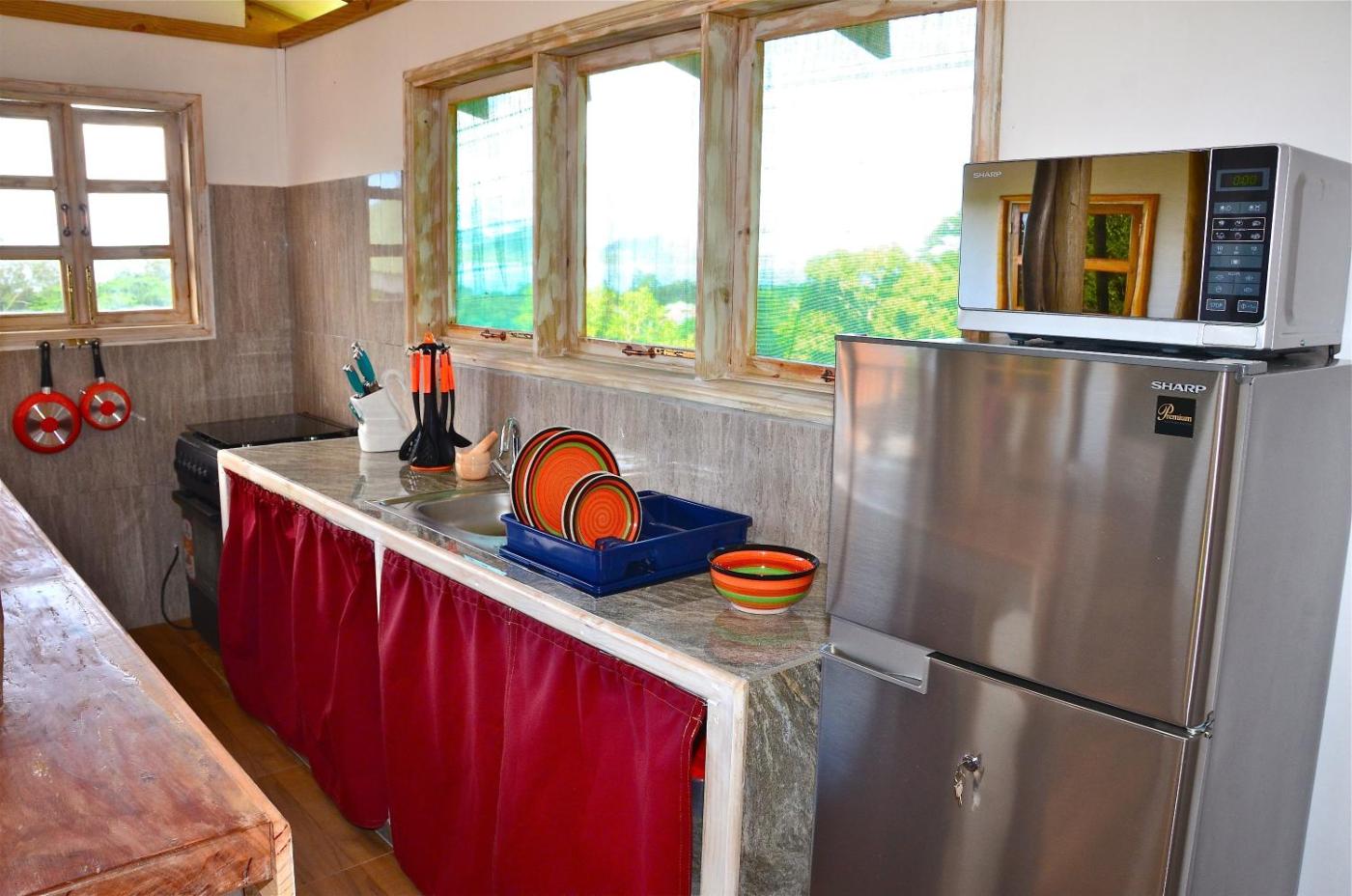 Two-Bedroom Bungalow. The air-conditioned bungalow has 2 bedrooms and 2 bathrooms with a bath and a shower. The fully equipped kitchen features a refrigerator, kitchenware and a microwave. Among the room amenities are a tea and coffee maker, a wardrobe, a tiled floor as well as a patio and sea views. The unit has 3 beds. ;