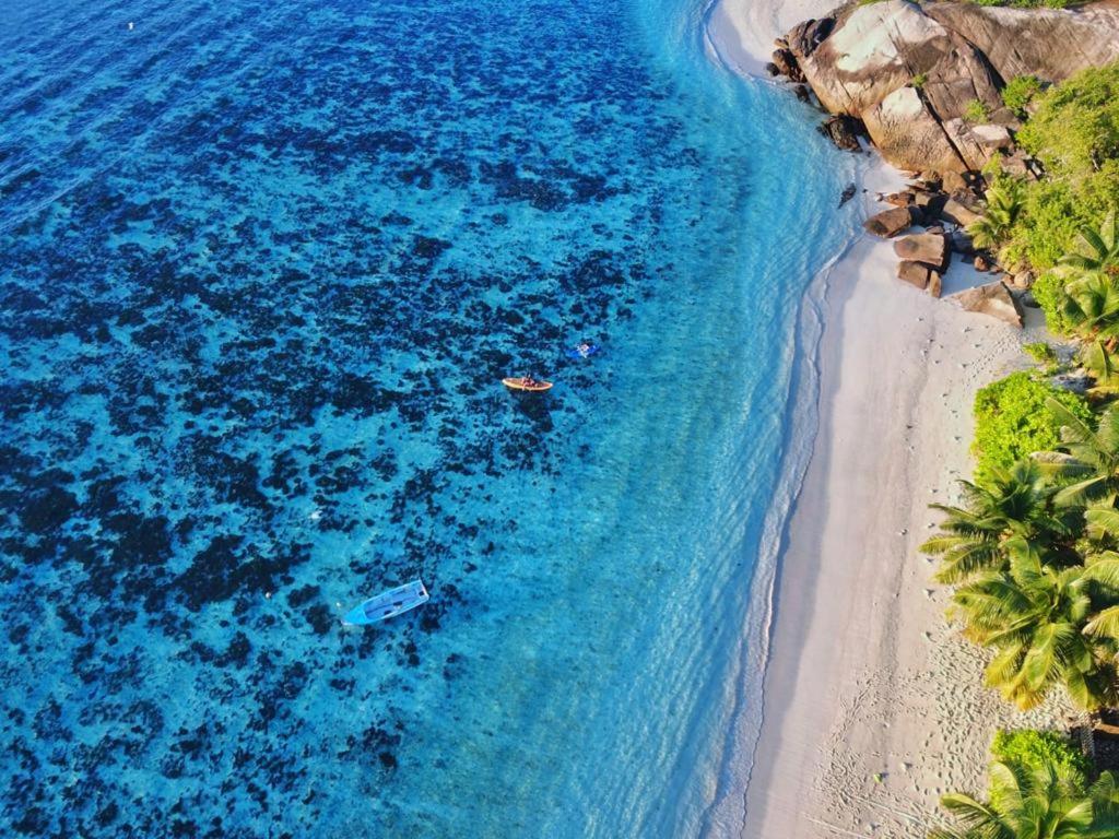 Beachfront Four-Bedroom Villa. This residence boasts 4 bedrooms, 2 of which are en suite. The other two bedrooms share the third bathroom. Each room is equipped with orthopaedic spring mattresses. The villa is air-conditioned throughout and features a fully-equipped kitchen, dining room and a large living room with a library of Seychelles books. There is also a covered terrace with large teak dining table, 12 sun loungers and a kayak. ;